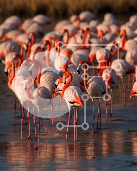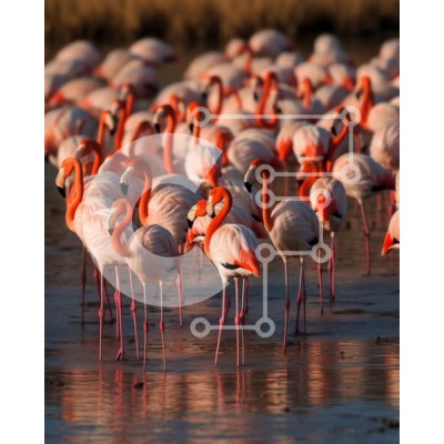 Υπάρχει δυνατότητα προσωποποίησης με δική σας φωτογραφία και προσαρμογής διαστάσεων κατόπιν παραγγελίας. Το συγεκεριμενο puzzle παρουσιαζει Αυτή η εικόνα παρουσιάζει ένα κοπάδι φλαμίνγκο που στέκεται σε ρηχά νερά με τα κεφάλια τους κρυμμένα κάτω από τα φτερά τους. Είναι ροζ με μακριά πόδια και λαιμό και τα φτερά τους αναστατώνονται στον αέρα. Ο ουρανός είναι συννεφιασμένος και ο ήλιος δύει, ρίχνοντας μια ζεστή πορ