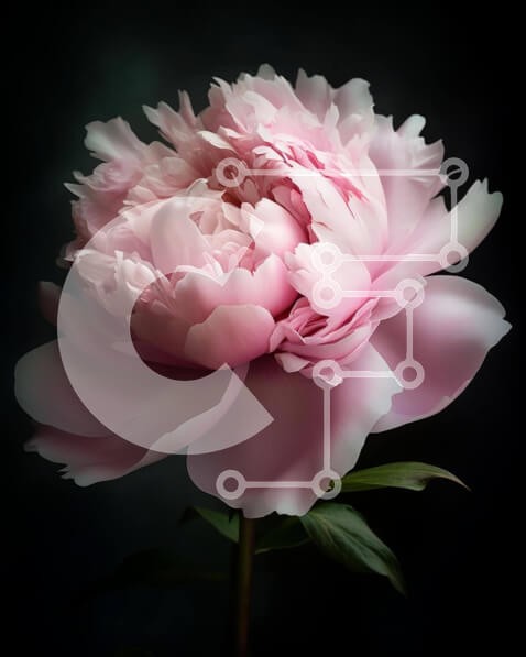 Υπάρχει δυνατότητα προσωποποίησης με δική σας φωτογραφία και προσαρμογής διαστάσεων κατόπιν παραγγελίας. Το συγεκεριμενο puzzle παρουσιαζει Η εικόνα παρουσιάζει ένα ροζ λουλούδι παιώνιας σε πρώτο πλάνο, με πράσινα φύλλα να το περιβάλλουν. Το λουλούδι φαίνεται να αναπτύσσεται έξω από το στέλεχος του, το οποίο φαίνεται μέσα από το σκούρο φόντο. Είναι πιθανό ότι το λουλούδι άνθισε πρόσφατα και έχει διατηρηθεί σε εσωτ