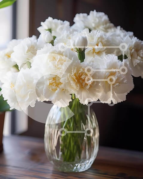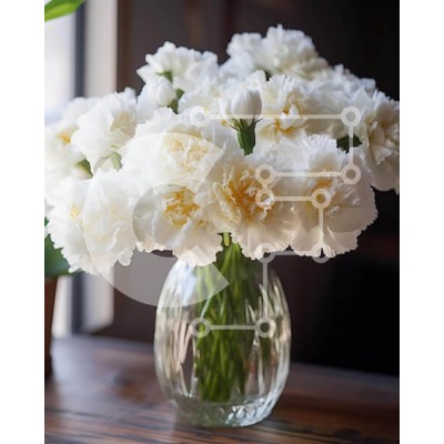 Υπάρχει δυνατότητα προσωποποίησης με δική σας φωτογραφία και προσαρμογής διαστάσεων κατόπιν παραγγελίας. Το συγεκεριμενο puzzle παρουσιαζει Αυτή η εικόνα παρουσιάζει ένα διαφανές γυάλινο βάζο γεμάτο με λευκά γαρίφαλα, τοποθετημένο στο κέντρο του τραπεζιού. Ένα μικρό φυτό σε γλάστρα κάθεται δίπλα στο βάζο, υποδηλώνοντας ότι μπορεί να χρησιμοποιηθεί για το πότισμα των λουλουδιών. Επιπλέον, υπάρχει μια διάταξη πρασίν