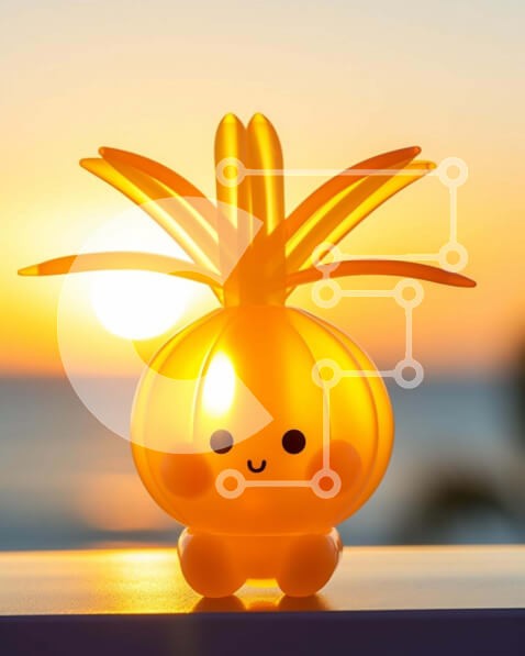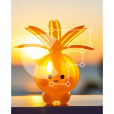 Υπάρχει δυνατότητα προσωποποίησης με δική σας φωτογραφία και προσαρμογής διαστάσεων κατόπιν παραγγελίας. Το συγεκεριμενο puzzle παρουσιαζει Η εικόνα παρουσιάζει ένα μικρό παιχνίδι ανανά με έντονα χρώματα που κάθεται πάνω από ένα τραπέζι εξωτερικού χώρου με τον ήλιο να δύει πίσω του. Φαίνεται να χαμογελά στον θεατή, κάτι που πιθανότατα οφείλεται στο γεγονός ότι είναι τοποθετημένο μπροστά στο ηλιοβασίλεμα. Επιπλέον,