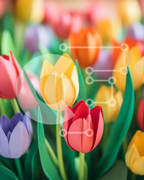 Υπάρχει δυνατότητα προσωποποίησης με δική σας φωτογραφία και προσαρμογής διαστάσεων κατόπιν παραγγελίας. Το συγεκεριμενο puzzle παρουσιαζει Αυτή η εικόνα παρουσιάζει μια ομάδα από χάρτινες τουλίπες σε διάφορα χρώματα και σχήματα, που είναι διατεταγμένες ώστε να φαίνονται σαν να αναπτύσσονται από το έδαφος. Το σκηνικό υποδηλώνει ότι αποτελούν μέρος μιας διάταξης κήπου. Δεν υπάρχουν πληροφορίες σχετικά με την προέλε