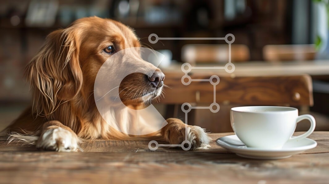 Υπάρχει δυνατότητα προσωποποίησης με δική σας φωτογραφία και προσαρμογής διαστάσεων κατόπιν παραγγελίας. Το συγεκεριμενο Puzzle 10x10 cm – 25 κομμ παρουσιαζει Αυτή η εικόνα παρουσιάζει ένα χρυσό ριτρίβερ να ακουμπά το κεφάλι του σε ένα ξύλινο τραπέζι σε ένα άνετο περιβάλλον καφέ. Ο σκύλος κοιτάζει με περιέργεια ένα λευκό φλιτζάνι καφέ που έχει τοποθετηθεί μπροστά του, δημιουργώντας μια γοητευτική
