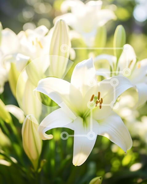 Υπάρχει δυνατότητα προσωποποίησης με δική σας φωτογραφία και προσαρμογής διαστάσεων κατόπιν παραγγελίας. Το συγεκεριμενο puzzle παρουσιαζει Η εικόνα παρουσιάζει ένα κοντινό πλάνο πολλών λευκών κρίνων που ανθίζουν στο φως του ήλιου. Τα λουλούδια φαίνεται να είναι πολύ φρέσκα και υγιή, πιθανότατα λόγω πρόσφατου ποτίσματος και φροντίδας. Οι ακτίνες του ήλιου λάμπουν στα λουλούδια, ενισχύοντας τη φωτεινότητα και την ε