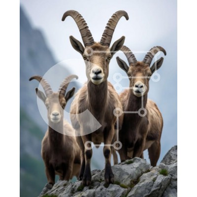 Υπάρχει δυνατότητα προσωποποίησης με δική σας φωτογραφία και προσαρμογής διαστάσεων κατόπιν παραγγελίας. Το συγεκεριμενο puzzle παρουσιαζει Αυτή η εικόνα παρουσιάζει τρία μεγάλα κερασφόρα ζώα που στέκονται στην κορυφή ενός βραχώδους βράχου. Τα ζώα έχουν καφέ γούνα και μακριά κυρτά κέρατα. Είναι σε σειρά, με ένα ζώο τοποθετημένο μπροστά από τα άλλα δύο. Το φόντο αποτελείται από έναν συνδυασμό νεφών και βουνών. Ένα
