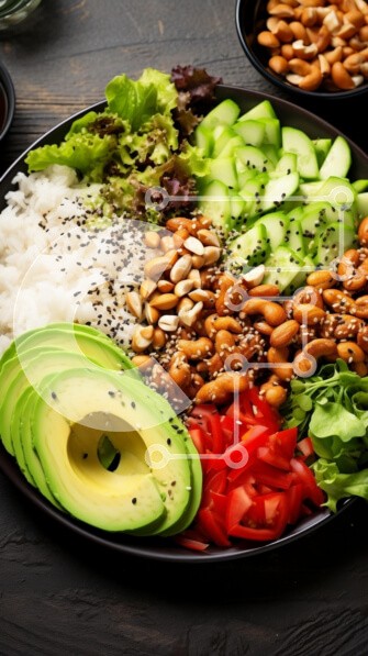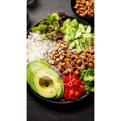 Υπάρχει δυνατότητα προσωποποίησης με δική σας φωτογραφία και προσαρμογής διαστάσεων κατόπιν παραγγελίας. Το συγεκεριμενο Puzzle 10x10 cm – 25 κομμ παρουσιαζει Αυτή η εικόνα παρουσιάζει μια όμορφα διαρρυθμισμένη πιατέλα με φρέσκα υλικά, με φέτες αβοκάντο, ντομάτες κομμένες σε κύβους, φυλλώδη λαχανικά και αγγούρι, μαζί με ένα μείγμα από ρύζι και διάφορους ξηρούς καρπούς. Τα ζωηρά χρώματα και οι υφές