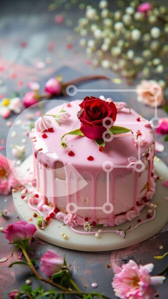 Υπάρχει δυνατότητα προσωποποίησης με δική σας φωτογραφία και προσαρμογής διαστάσεων κατόπιν παραγγελίας. Το συγεκεριμενο Puzzle 10x10 cm – 25 κομμ παρουσιαζει Η εικόνα παρουσιάζει ένα ροζ κέικ στολισμένο με τριαντάφυλλα και λουλούδια, τοποθετημένο σε ένα όμορφα διακοσμημένο λευκό τραπέζι που περιβάλλεται από floral στοιχεία. Φρέσκα φρούτα όπως φράουλες, βατόμουρα και σταφύλια είναι επίσης διάσπαρτ