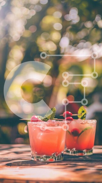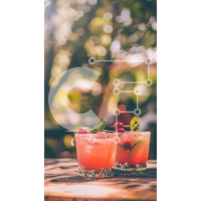 Υπάρχει δυνατότητα προσωποποίησης με δική σας φωτογραφία και προσαρμογής διαστάσεων κατόπιν παραγγελίας. Το συγεκεριμενο Puzzle 10x10 cm – 25 κομμ παρουσιαζει Η εικόνα παρουσιάζει δύο ροζ μαργαρίτες που κάθονται σε ένα ξύλινο τραπέζι στο πρώτο πλάνο. Το ένα από τα ποτά είναι διακοσμημένο με κεράσια, ενώ το άλλο είναι διακοσμημένο με φύλλα μέντας. Υπάρχουν πολλά δέντρα και θάμνοι γύρω από το τραπέζ