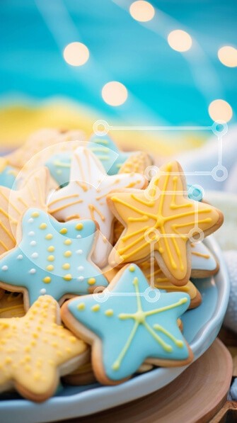 Υπάρχει δυνατότητα προσωποποίησης με δική σας φωτογραφία και προσαρμογής διαστάσεων κατόπιν παραγγελίας. Το συγεκεριμενο Puzzle 10x10 cm – 25 κομμ παρουσιαζει Η εικόνα δείχνει ένα πιάτο με μπισκότα σε σχήμα αστεριού σε διάφορα χρώματα τοποθετημένα σε ένα τραπέζι δίπλα στο νερό. Μερικά μπισκότα φαίνονται φρεσκοψημένα, ενώ άλλα φαίνονται πιο παλιά. Ένα μοναδικό Puzzle 10x10 cm – 25 κομμπου συνδυάζε