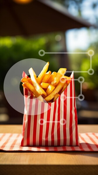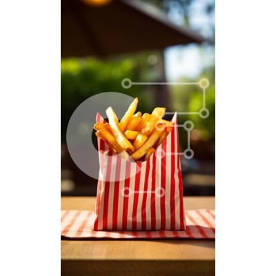 Υπάρχει δυνατότητα προσωποποίησης με δική σας φωτογραφία και προσαρμογής διαστάσεων κατόπιν παραγγελίας. Το συγεκεριμενο Puzzle 10x10 cm – 25 κομμ παρουσιαζει Αυτή η εικόνα παρουσιάζει μια μερίδα χρυσές τηγανιτές πατάτες, που παρουσιάζονται σε μια ριγέ κόκκινη και λευκή χάρτινη σακούλα. Οι πατάτες στοιβάζονται ψηλά, αναδεικνύοντας την τραγανή υφή και την ελκυστική εμφάνισή τους. Το φόντο είναι θολ