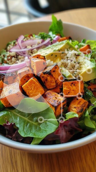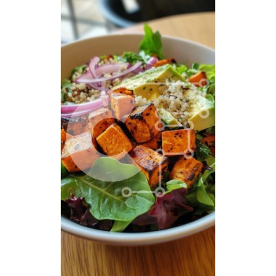 Υπάρχει δυνατότητα προσωποποίησης με δική σας φωτογραφία και προσαρμογής διαστάσεων κατόπιν παραγγελίας. Το συγεκεριμενο Puzzle 10x10 cm – 25 κομμ παρουσιαζει Η εικόνα δείχνει μια ζωντανή σαλατιέρα γεμάτη με φρέσκα χόρτα, κινόα και ψητές γλυκοπατάτες. Η σαλάτα ολοκληρώνεται με φέτες αβοκάντο και κόκκινα κρεμμύδια, δημιουργώντας μια πολύχρωμη και νόστιμη παρουσίαση. Οι ζεστοί τόνοι της ψητής γλυκοπ