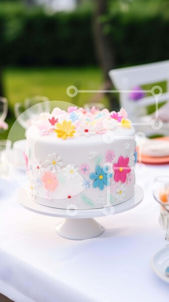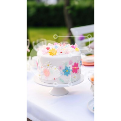 Υπάρχει δυνατότητα προσωποποίησης με δική σας φωτογραφία και προσαρμογής διαστάσεων κατόπιν παραγγελίας. Το συγεκεριμενο Puzzle 10x10 cm – 25 κομμ παρουσιαζει Η εικόνα παρουσιάζει μια λευκή τούρτα με πολύχρωμες διακοσμήσεις, τοποθετημένη στην κορυφή ενός τραπεζιού εξωτερικού χώρου. Υπάρχουν πολλά πιάτα και μπολ που περιβάλλουν την τούρτα, υποδηλώνοντας ότι σερβιρίστηκε ως μέρος κάποιου είδους γιορ