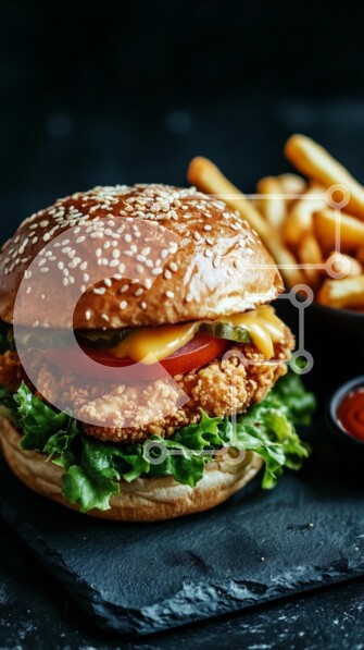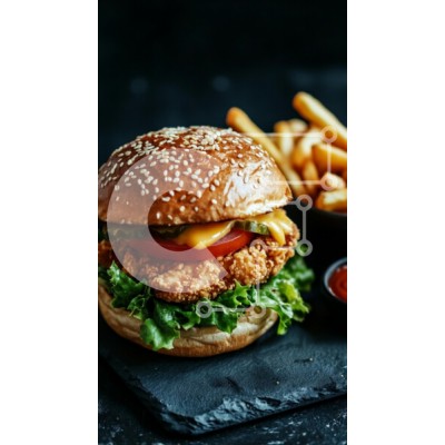 Υπάρχει δυνατότητα προσωποποίησης με δική σας φωτογραφία και προσαρμογής διαστάσεων κατόπιν παραγγελίας. Το συγεκεριμενο Puzzle 10x10 cm – 25 κομμ παρουσιαζει Αυτή η εικόνα παρουσιάζει ένα νόστιμο χάμπουργκερ με ένα τσουρέκι με σουσαμιού γεμάτο με τραγανό τηγανητό κοτόπουλο, φρέσκο μαρούλι, ντομάτα, τουρσιά και λιωμένο τυρί. Το μπιφτέκι τοποθετείται σε μια σκούρα επιφάνεια από σχιστόλιθο και στο