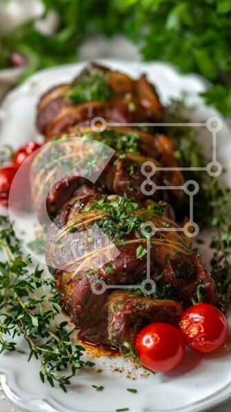 Υπάρχει δυνατότητα προσωποποίησης με δική σας φωτογραφία και προσαρμογής διαστάσεων κατόπιν παραγγελίας. Το συγεκεριμενο Puzzle 10x10 cm – 25 κομμ παρουσιαζει Η εικόνα δείχνει ένα όμορφα διαρρυθμισμένο πιάτο ψητού κρέατος, γαρνιρισμένο με φρέσκα μυρωδικά και περιτριγυρισμένο από ζωηρά ντοματίνια. Το κρέας δένεται με σπάγκο και ολοκληρώνεται με ψιλοκομμένα πράσινα μυρωδικά, δημιουργώντας ένα ορεκτι