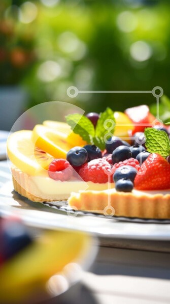 Υπάρχει δυνατότητα προσωποποίησης με δική σας φωτογραφία και προσαρμογής διαστάσεων κατόπιν παραγγελίας. Το συγεκεριμενο Puzzle 10x10 cm – 25 κομμ παρουσιαζει Η εικόνα παρουσιάζει μια τάρτα γεμάτη φρούτα, η οποία κόβεται σε φέτες και τοποθετείται πάνω από ένα τραπέζι εξωτερικού χώρου. Υπάρχουν πολλά διαφορετικά είδη φρούτων που υπάρχουν στο πιάτο, όπως φράουλες, σμέουρα, μαύρες σταφίδες και βατόμο