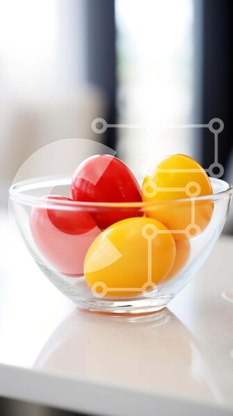 Υπάρχει δυνατότητα προσωποποίησης με δική σας φωτογραφία και προσαρμογής διαστάσεων κατόπιν παραγγελίας. Το συγεκεριμενο Puzzle 10x10 cm – 25 κομμ παρουσιαζει Αυτή η εικόνα παρουσιάζει ένα διαφανές γυάλινο μπολ γεμάτο με κόκκινα και κίτρινα αυγά, τοποθετημένα σε διαφορετικές θέσεις στο τραπέζι. Υπάρχει επίσης ένα άδειο ποτήρι κοντά, που υποδηλώνει διακοσμητική τοποθέτηση. Η συνολική σκηνή αποτυπών