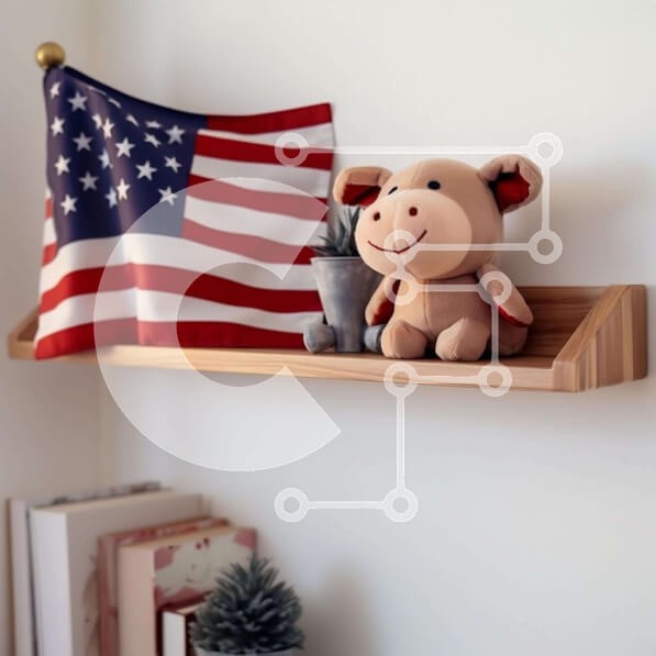 Υπάρχει δυνατότητα προσωποποίησης με δική σας φωτογραφία και προσαρμογής διαστάσεων κατόπιν παραγγελίας. Το συγεκεριμενο Puzzle 10x10 cm – 25 κομμ παρουσιαζει Η εικόνα απεικονίζει ένα ξύλινο ράφι με μια αμερικανική σημαία κρεμασμένη σε αυτό. Ένα γεμιστό γουρούνι κάθεται στο ράφι, ενώ βιβλία και άλλα αντικείμενα τοποθετούνται κοντά. Δεν υπάρχει καμία ένδειξη για το εάν αυτά τα αντικείμενα ανήκουν ή