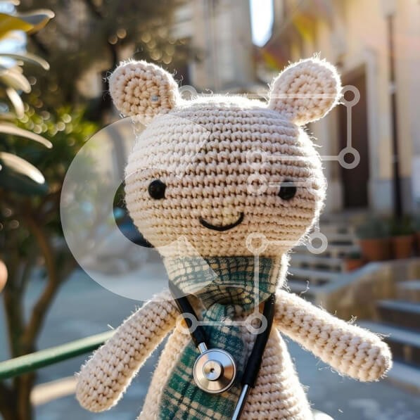 Υπάρχει δυνατότητα προσωποποίησης με δική σας φωτογραφία και προσαρμογής διαστάσεων κατόπιν παραγγελίας. Το συγεκεριμενο Puzzle 10x10 cm – 25 κομμ παρουσιαζει Η εικόνα απεικονίζει ένα κροσέ αρκουδάκι, το οποίο κάθεται στο έδαφος κοντά σε κάποιες σκάλες. Είναι ντυμένο με ένα πορτοκαλί κασκόλ και λευκό στηθοσκόπιο, υποδηλώνοντας ότι μπορεί να ανήκει σε κάποιον που έχει πρόσφατα αποφοιτήσει από την ι