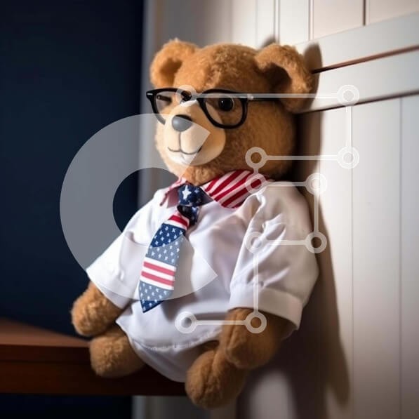 Υπάρχει δυνατότητα προσωποποίησης με δική σας φωτογραφία και προσαρμογής διαστάσεων κατόπιν παραγγελίας. Το συγεκεριμενο Puzzle 10x10 cm – 25 κομμ παρουσιαζει Η εικόνα απεικονίζει ένα αρκουδάκι που φοράει γυαλιά και μια γραβάτα με θέμα την αμερικανική σημαία, ακουμπισμένο σε έναν τοίχο. Άλλα λούτρινα ζωάκια όπως κούκλες ή ειδώλια μπορεί να υπάρχουν στο δωμάτιο. Ένα μοναδικό Puzzle 10x10 cm – 25 κ