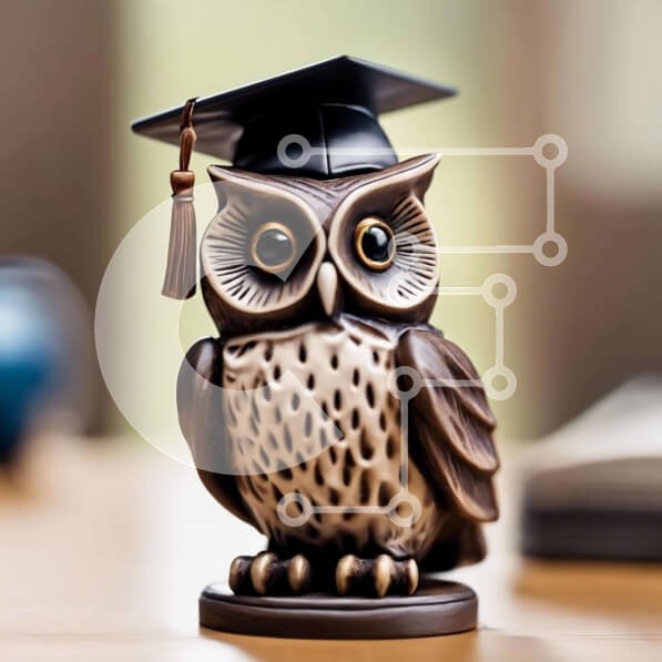 Υπάρχει δυνατότητα προσωποποίησης με δική σας φωτογραφία και προσαρμογής διαστάσεων κατόπιν παραγγελίας. Το συγεκεριμενο Puzzle 10x10 cm – 25 κομμ παρουσιαζει Η εικόνα απεικονίζει ένα ειδώλιο κουκουβάγιας με ένα κάλυμμα αποφοίτησης στο κεφάλι, τοποθετημένο σε ένα τραπέζι δίπλα σε βιβλία ή σχετικά αντικείμενα. Το ειδώλιο της κουκουβάγιας φαίνεται να είναι διακοσμητικό, πιθανότατα συμβολίζοντας τη σ