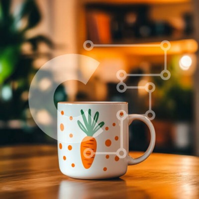 Υπάρχει δυνατότητα προσωποποίησης με δική σας φωτογραφία και προσαρμογής διαστάσεων κατόπιν παραγγελίας. Το συγεκεριμενο Puzzle 10x10 cm – 25 κομμ παρουσιαζει Η εικόνα παρουσιάζει μια λευκή κεραμική κούπα διακοσμημένη με παιχνιδιάρικο σχέδιο καρότου, με πράσινα φύλλα και περιτριγυρισμένη από πορτοκαλί πουά. Η κούπα τοποθετείται σε ένα ξύλινο τραπέζι, με ένα απαλά θολό φόντο που υποδηλώνει ένα ζεστ