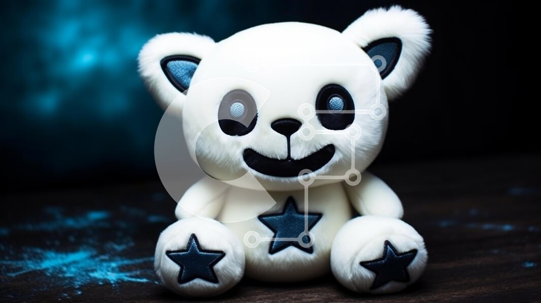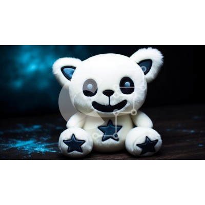 Υπάρχει δυνατότητα προσωποποίησης με δική σας φωτογραφία και προσαρμογής διαστάσεων κατόπιν παραγγελίας. Το συγεκεριμενο Puzzle 10x10 cm – 25 κομμ παρουσιαζει Αυτή η εικόνα παρουσιάζει ένα χαριτωμένο βελούδινο παιχνίδι αρκούδας με λευκό γούνινο παλτό και σχέδια μαύρα αστέρια. Η αρκούδα έχει μεγάλα, εκφραστικά μάτια και ένα χαρούμενο χαμόγελο, κάθεται σε μια ξύλινη επιφάνεια με ένα απαλά θολό μπλε