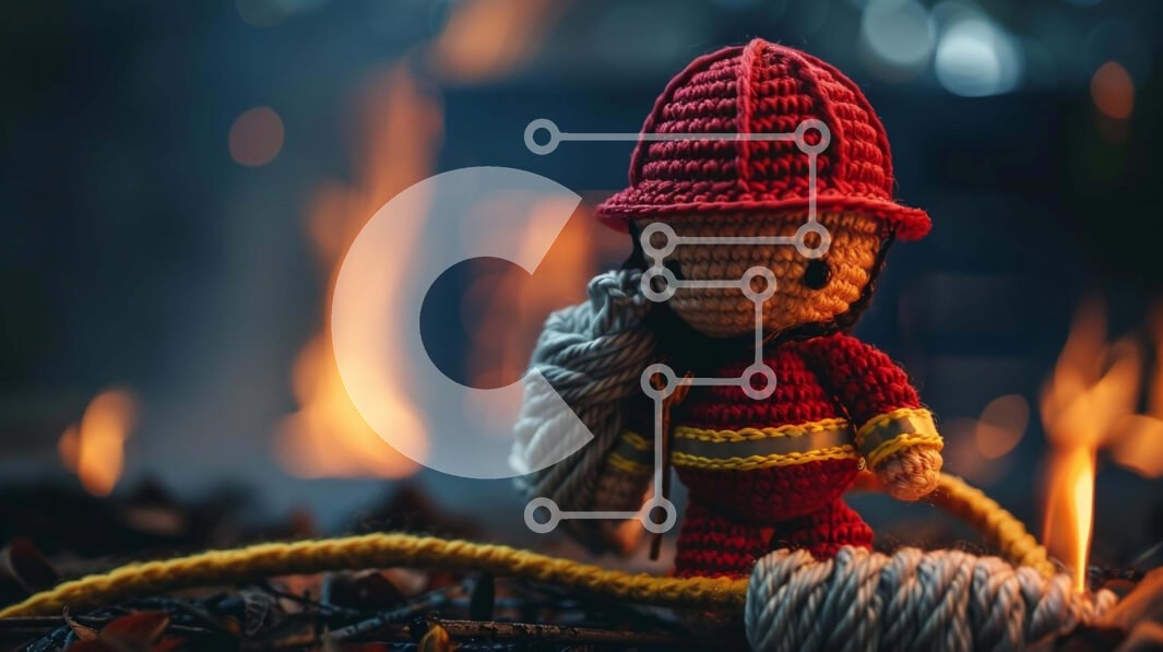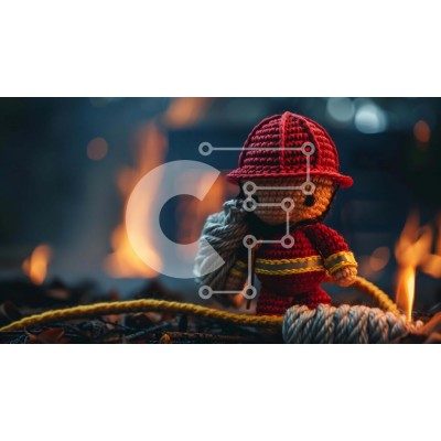 Υπάρχει δυνατότητα προσωποποίησης με δική σας φωτογραφία και προσαρμογής διαστάσεων κατόπιν παραγγελίας. Το συγεκεριμενο Puzzle 10x10 cm – 25 κομμ παρουσιαζει Η εικόνα παρουσιάζει μια κροσέ κούκλα πυροσβέστη, η οποία στέκεται μπροστά σε μια ανοιχτή φωτιά. Η κούκλα είναι ντυμένη με κόκκινα ρούχα και κρατά το σχοινί που τη συνδέει με τον πυροσβεστήρα. Φαίνεται ότι είναι έτοιμο να βοηθήσει να σβήσει