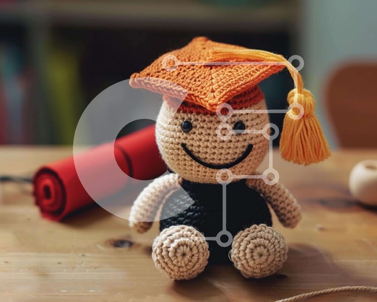 Υπάρχει δυνατότητα προσωποποίησης με δική σας φωτογραφία και προσαρμογής διαστάσεων κατόπιν παραγγελίας. Το συγεκεριμενο Puzzle 10x10 cm – 25 κομμ παρουσιαζει Η εικόνα δείχνει ένα κροσέ κούκλα παιχνίδι με ένα καπέλο αποφοίτησης και μια χαρούμενη έκφραση, τοποθετημένη σε ένα ξύλινο τραπέζι δίπλα σε σταθερά αντικείμενα όπως στυλό, μολύβια και μια γόμα. Η σκηνή υποδηλώνει ένα παιχνιδιάρικο και εκπαιδ