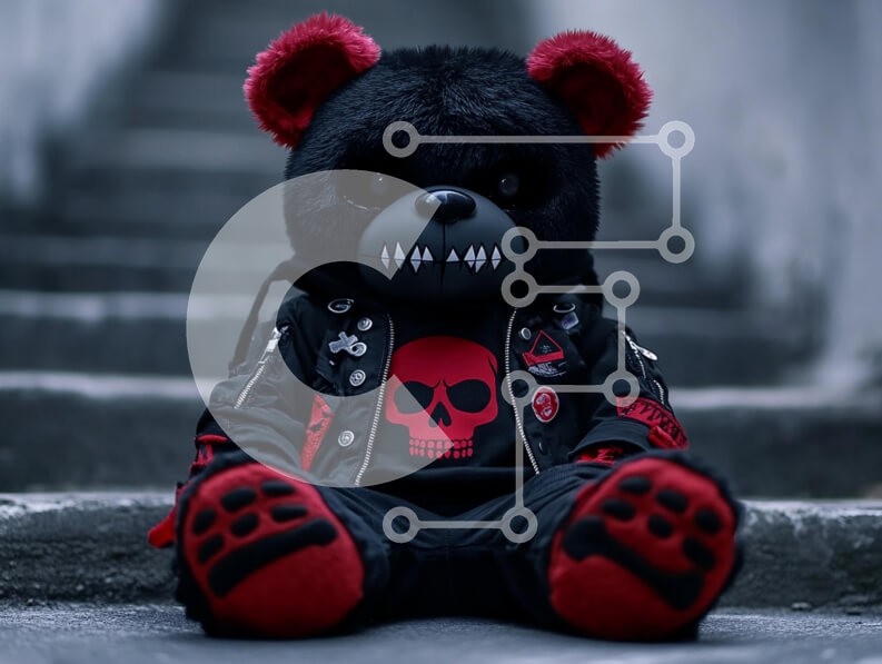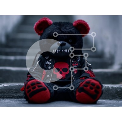 Υπάρχει δυνατότητα προσωποποίησης με δική σας φωτογραφία και προσαρμογής διαστάσεων κατόπιν παραγγελίας. Το συγεκεριμενο Puzzle 10x10 cm – 25 κομμ παρουσιαζει Η εικόνα παρουσιάζει ένα στυλιζαρισμένο βελούδινο παιχνίδι μαύρης αρκούδας με κόκκινες πινελιές, ντυμένο με μαύρο δερμάτινο μπουφάν διακοσμημένο με μπαλώματα και σχέδιο κρανίου. Η αρκούδα κάθεται στις σκάλες, παρουσιάζοντας ένα μοναδικό μείγ