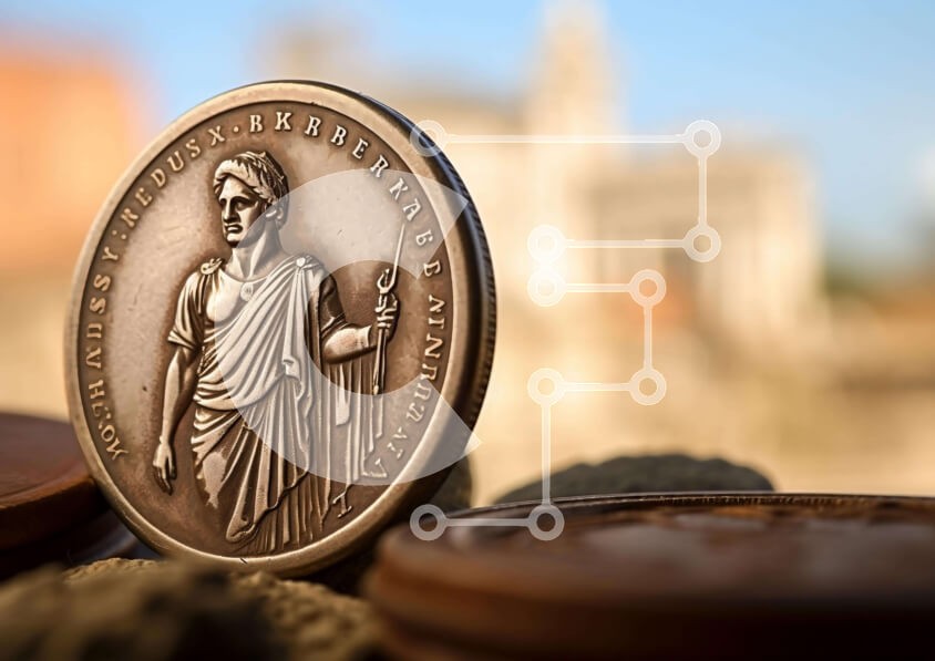 Υπάρχει δυνατότητα προσωποποίησης με δική σας φωτογραφία και προσαρμογής διαστάσεων κατόπιν παραγγελίας. Το συγεκεριμενο Puzzle 10x10 cm – 25 κομμ παρουσιαζει Αυτή η εικόνα παρουσιάζει ένα νόμισμα με ένα πορτρέτο του Ιουλίου Καίσαρα, τοποθετημένο πάνω από άλλα νομίσματα. Είναι ένα ιστορικό τεχνούργημα που θα μπορούσε να χρησιμοποιηθεί για τον εορτασμό σημαντικών γεγονότων, όπως η Μάχη της Σαλαμίνα