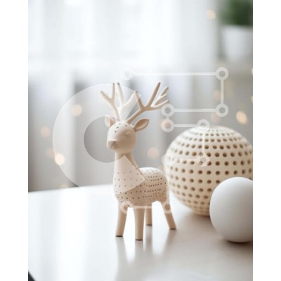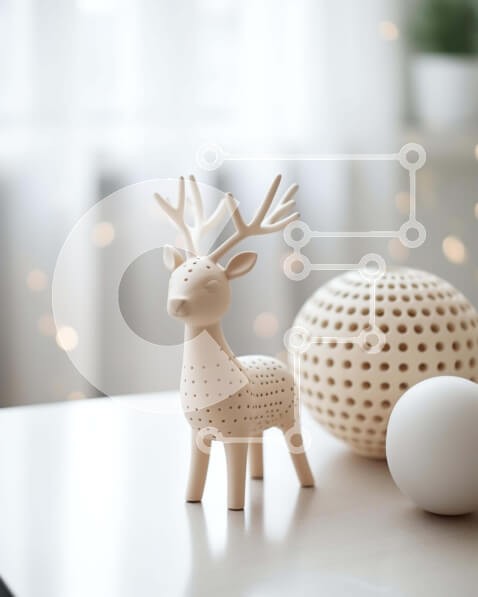 Υπάρχει δυνατότητα προσωποποίησης με δική σας φωτογραφία και προσαρμογής διαστάσεων κατόπιν παραγγελίας. Το συγεκεριμενο Puzzle 10x10 cm – 25 κομμ παρουσιαζει Αυτή η εικόνα παρουσιάζει ένα ξύλινο ειδώλιο ελαφιού τοποθετημένο σε ένα τραπέζι που περιβάλλεται από στολίδια και άλλα διακοσμητικά. Η σκηνή είναι γεμάτη οπτικό ενδιαφέρον, με μικρές μπάλες διάσπαρτες στο δωμάτιο. Δύο λευκές μπάλες δίπλα στ