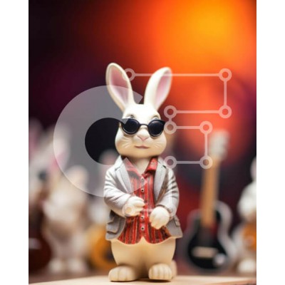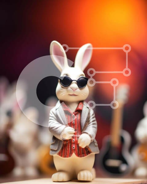 Υπάρχει δυνατότητα προσωποποίησης με δική σας φωτογραφία και προσαρμογής διαστάσεων κατόπιν παραγγελίας. Το συγεκεριμενο Puzzle 10x10 cm – 25 κομμ παρουσιαζει Αυτή η εικόνα παρουσιάζει ένα ειδώλιο λευκού κουνελιού που φοράει γυαλιά ηλίου και στέκεται μπροστά από πολλά μουσικά όργανα, συμπεριλαμβανομένων κιθάρων και ντραμς. Είναι πιθανό ότι το ειδώλιο είναι μέρος της συλλογής ενός καλλιτέχνη ή μουσ