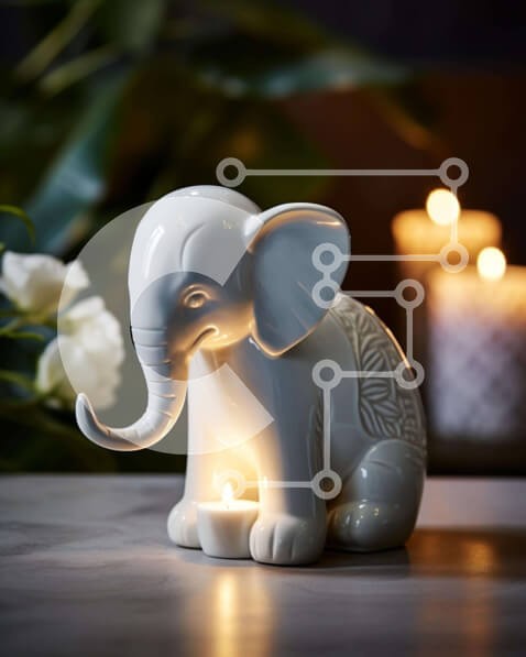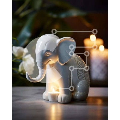 Υπάρχει δυνατότητα προσωποποίησης με δική σας φωτογραφία και προσαρμογής διαστάσεων κατόπιν παραγγελίας. Το συγεκεριμενο Puzzle 10x10 cm – 25 κομμ παρουσιαζει Αυτή η εικόνα παρουσιάζει ένα μικρό, λευκό ειδώλιο ελέφαντα που κάθεται σε ένα τραπέζι δίπλα σε πολλά κεριά και λουλούδια. Το ειδώλιο είναι σε καλή κατάσταση, υποδεικνύοντας τη σωστή συντήρηση. Είναι πιθανώς μια προσεκτική αγορά για ένα δώρο
