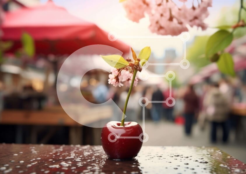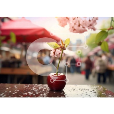 Υπάρχει δυνατότητα προσωποποίησης με δική σας φωτογραφία και προσαρμογής διαστάσεων κατόπιν παραγγελίας. Το συγεκεριμενο puzzle παρουσιαζει Η εικόνα δείχνει ένα κόκκινο κεράσι που κάθεται πάνω από ένα τραπέζι εξωτερικού χώρου με ομπρέλες στο φόντο. Αρκετοί άνθρωποι στέκονται γύρω από το τραπέζι, κάποιοι από τους οποίους φαίνεται να απολαμβάνουν την ώρα τους στην αγορά. Ένα μικρό λουλούδι αναπτύσσεται από το κεράσι