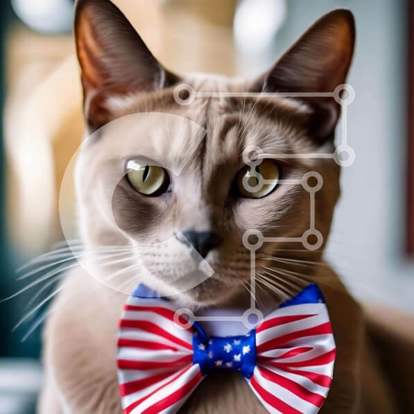 Υπάρχει δυνατότητα προσωποποίησης με δική σας φωτογραφία και προσαρμογής διαστάσεων κατόπιν παραγγελίας. Το συγεκεριμενο Puzzle 10x10 cm – 25 κομμ παρουσιαζει Η εικόνα απεικονίζει μια γάτα που φορά ένα παπιγιόν με θέμα την αμερικανική σημαία. Η γάτα κάθεται μπροστά στην κάμερα, με το κεφάλι της να γέρνει ελαφρά στο πλάι. Φαίνεται να είναι χαλαρό και άνετο όταν φοράει το παπιγιόν, κάτι που μπορεί ν