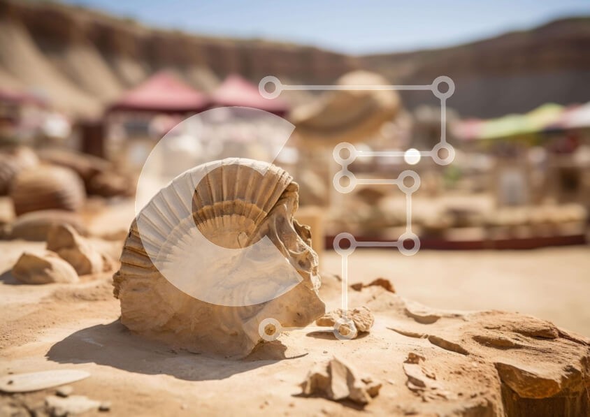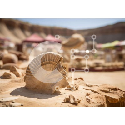Υπάρχει δυνατότητα προσωποποίησης με δική σας φωτογραφία και προσαρμογής διαστάσεων κατόπιν παραγγελίας. Το συγεκεριμενο puzzle παρουσιαζει Η εικόνα παρουσιάζει ένα απολίθωμα αμμωνίτη που εκτίθεται σε ένα περιβάλλον της ερήμου. Υπάρχουν πολλές σκηνές και ομπρέλες που περιβάλλουν το αντικείμενο, υποδηλώνοντας ότι μπορεί να είναι μέρος μιας υπαίθριας έκθεσης. Είναι πιθανό οι επισκέπτες της εκδήλωσης να μπορούν να αλ