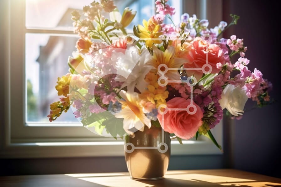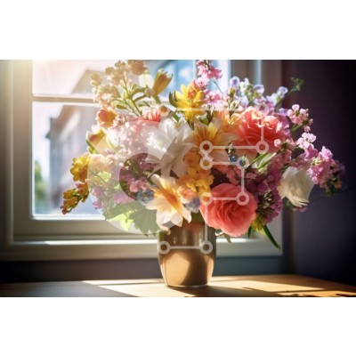 Υπάρχει δυνατότητα προσωποποίησης με δική σας φωτογραφία και προσαρμογής διαστάσεων κατόπιν παραγγελίας. Το συγεκεριμενο puzzle παρουσιαζει Αυτή η εικόνα είναι μια φωτογραφία νεκρής φύσης ενός βάζου γεμάτου με πολύχρωμα λουλούδια σε ένα ξύλινο τραπέζι. Τα λουλούδια είναι τοποθετημένα με τρόπο που δημιουργεί μια όμορφη και αρμονική σύνθεση. Το φυσικό φως που περνά μέσα από το παράθυρο προσθέτει βάθος και ζεστασιά σ