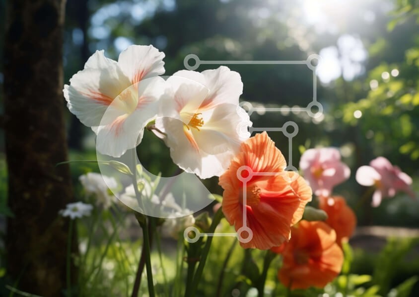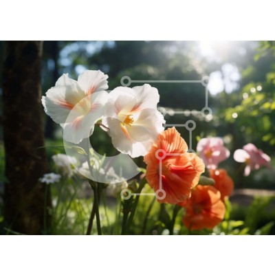 Υπάρχει δυνατότητα προσωποποίησης με δική σας φωτογραφία και προσαρμογής διαστάσεων κατόπιν παραγγελίας. Το συγεκεριμενο puzzle παρουσιαζει Η εικόνα δείχνει μια ομάδα από λευκά, πορτοκαλί και ροζ λουλούδια που ανθίζουν σε ένα δασικό περιβάλλον. Τα πράσινα φύλλα συμπληρώνουν τα πολύχρωμα λουλούδια, ενισχύοντας τη φυσική ομορφιά της σκηνής. Υπονοεί έναν πιθανό κήπο με λουλούδια ή πρόσφατες φυτεύσεις. Ένα μοναδικό p