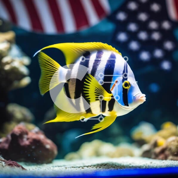 Υπάρχει δυνατότητα προσωποποίησης με δική σας φωτογραφία και προσαρμογής διαστάσεων κατόπιν παραγγελίας. Το συγεκεριμενο Puzzle 10x10 cm – 25 κομμ παρουσιαζει Η εικόνα δείχνει ένα ασπρόμαυρο ψάρι να κολυμπά σε ένα ενυδρείο με μια αμερικανική σημαία πίσω του. Το ψάρι φαίνεται να απολαμβάνει τον χρόνο του στη δεξαμενή, καθώς κολυμπά γύρω από τα βράχια και τα κοράλλια. Είναι πιθανό το ψάρι να έχει δι