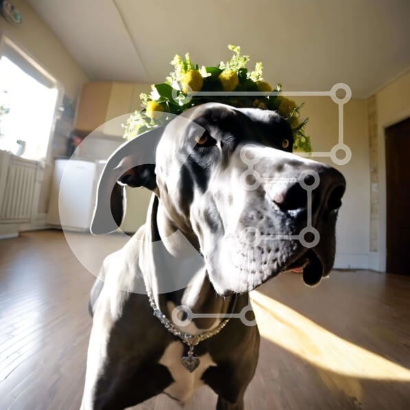 Υπάρχει δυνατότητα προσωποποίησης με δική σας φωτογραφία και προσαρμογής διαστάσεων κατόπιν παραγγελίας. Το συγεκεριμενο Puzzle 10x10 cm – 25 κομμ παρουσιαζει Στην εικόνα απεικονίζεται ένας μεγάλος σκύλος με κορώνα λουλουδιών, που στέκεται στη μέση ενός δωματίου. Ο σκύλος είναι στραμμένος προς την κάμερα και φαίνεται χαλαρός και άνετος. Ένα μοναδικό Puzzle 10x10 cm – 25 κομμπου συνδυάζει ποιότητα