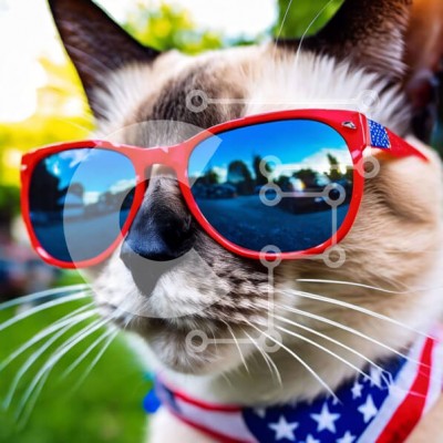 Υπάρχει δυνατότητα προσωποποίησης με δική σας φωτογραφία και προσαρμογής διαστάσεων κατόπιν παραγγελίας. Το συγεκεριμενο Puzzle 10x10 cm – 25 κομμ παρουσιαζει Η εικόνα απεικονίζει μια γάτα που φοράει κόκκινα γυαλιά ηλίου με μια μπαντάνα με αμερικανική σημαία στο λαιμό της. Η γάτα κάθεται στο γρασίδι και φαίνεται να απολαμβάνει την ύπαιθρο, πιθανώς να παίζει με παιχνίδια ή άλλα αντικείμενα. Ένα μο