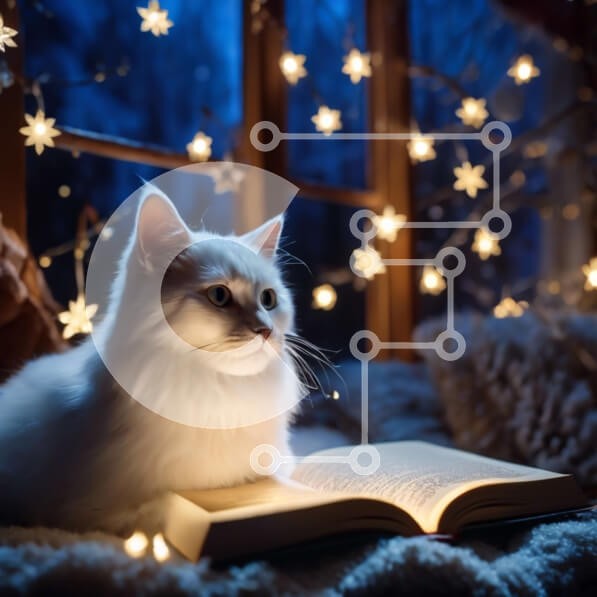 Υπάρχει δυνατότητα προσωποποίησης με δική σας φωτογραφία και προσαρμογής διαστάσεων κατόπιν παραγγελίας. Το συγεκεριμενο Puzzle 10x10 cm – 25 κομμ παρουσιαζει Αυτή η εικόνα παρουσιάζει μια λευκή γάτα που κάθεται πάνω σε ένα ανοιχτό βιβλίο, το οποίο είναι διακοσμημένο με χριστουγεννιάτικα λαμπάκια. Είναι τοποθετημένο μπροστά από ένα παράθυρο και η γάτα φαίνεται άνετη και χαλαρή. Η γάτα μπορεί να δι