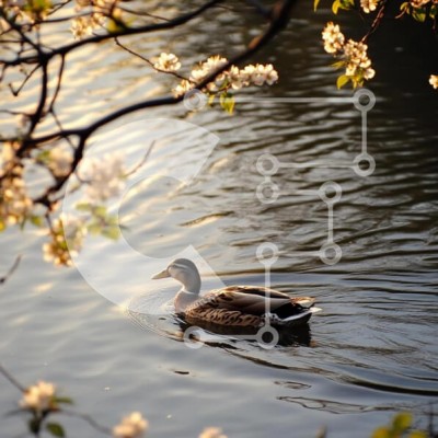 Υπάρχει δυνατότητα προσωποποίησης με δική σας φωτογραφία και προσαρμογής διαστάσεων κατόπιν παραγγελίας. Το συγεκεριμενο Puzzle 10x10 cm – 25 κομμ παρουσιαζει Η εικόνα απεικονίζει μια γαλήνια σκηνή μιας πάπιας που κολυμπά σε ένα ήρεμο υδάτινο σώμα, που περιβάλλεται από ανθισμένα λουλούδια πάνω σε κλαδιά. Το ζεστό χρυσό φως του ηλιοβασιλέματος αντανακλάται από την επιφάνεια του νερού, δημιουργώντας
