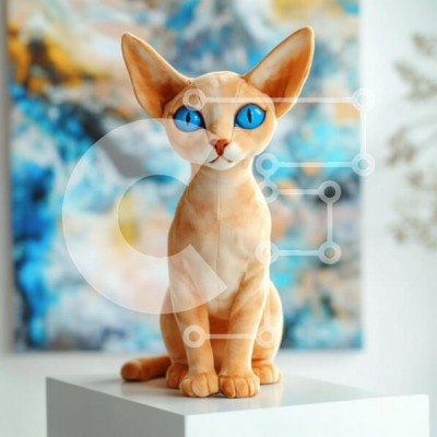 Υπάρχει δυνατότητα προσωποποίησης με δική σας φωτογραφία και προσαρμογής διαστάσεων κατόπιν παραγγελίας. Το συγεκεριμενο Puzzle 10x10 cm – 25 κομμ παρουσιαζει Αυτή η εικόνα παρουσιάζει μια στυλιζαρισμένη βελούδινη αναπαράσταση μιας γάτας, που χαρακτηρίζεται από τα μεγάλα μπλε μάτια και την πορτοκαλί γούνα της. Η γάτα κάθεται όρθια σε ένα λευκό βάθρο, με ένα πολύχρωμο, αφηρημένο φόντο που περιλαμβά