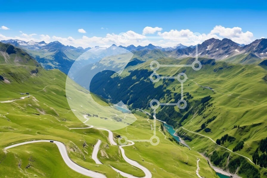 Υπάρχει δυνατότητα προσωποποίησης με δική σας φωτογραφία και προσαρμογής διαστάσεων κατόπιν παραγγελίας. Το συγεκεριμενο puzzle παρουσιαζει Η εικόνα παρουσιάζει μια εναέρια άποψη ενός ελικοειδή ορεινού δρόμου στις Ελβετικές Άλπεις, με πράσινο γρασίδι και βουνά να τον περιβάλλουν. Οι δρόμοι με καμπύλες κατά μήκος της κοιλάδας προτείνουν ευκαιρίες για πεζοπορία ή ποδηλασία. Η γραφική ομορφιά αυτής της περιοχής πιθαν