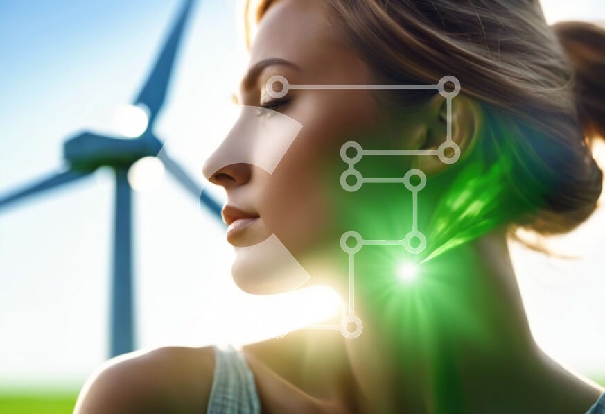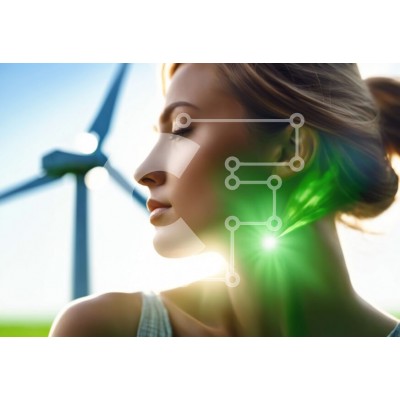 Υπάρχει δυνατότητα προσωποποίησης με δική σας φωτογραφία και προσαρμογής διαστάσεων κατόπιν παραγγελίας. Το συγεκεριμενο puzzle παρουσιαζει Αυτή η εικόνα δείχνει μια γυναίκα που αντιμετωπίζει ανεμογεννήτριες στο βάθος. Το πρόσωπο της γυναίκας φωτίζεται από ένα πράσινο φως, υποδεικνύοντας πιθανώς τη χρήση ενεργειακά αποδοτικής μάσκας για προστασία από την υπεριώδη ακτινοβολία. Η σκηνή περιλαμβάνει επίσης αρκετούς α