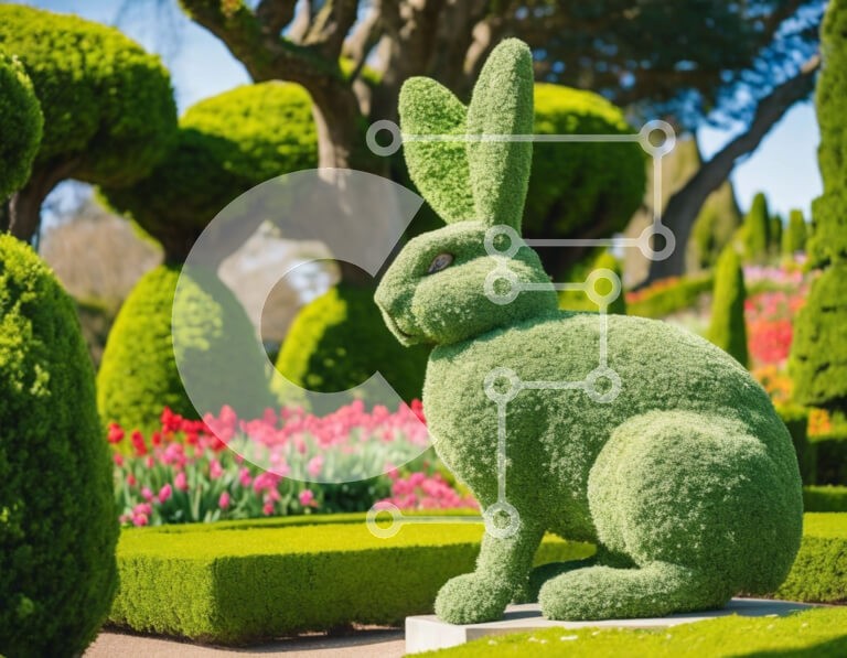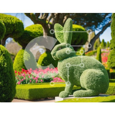 Υπάρχει δυνατότητα προσωποποίησης με δική σας φωτογραφία και προσαρμογής διαστάσεων κατόπιν παραγγελίας. Το συγεκεριμενο puzzle παρουσιαζει Αυτή η εικόνα παρουσιάζει ένα μεγάλο γλυπτό κουνελιού που βρίσκεται σε έναν διακοσμητικό κήπο. Το γλυπτό είναι φτιαγμένο από πράσινο, συνδυάζεται άψογα με τους γύρω θάμνους και τα δέντρα. Επιπλέον, διάφορα ανθοφόρα φυτά όπως τριαντάφυλλα, τουλίπες και κρίνους κοσμούν την περιο