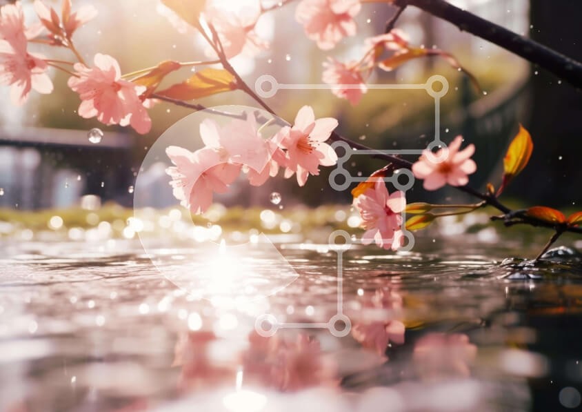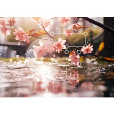Υπάρχει δυνατότητα προσωποποίησης με δική σας φωτογραφία και προσαρμογής διαστάσεων κατόπιν παραγγελίας. Το συγεκεριμενο puzzle παρουσιαζει Η εικόνα παρουσιάζει ένα κλαδί δέντρου με ροζ λουλούδια στο πρώτο πλάνο, μερικώς βυθισμένο στο νερό. Μικρές σταγόνες νερού στα κλαδιά υποδηλώνουν ότι το νερό της βροχής εκτοξεύεται από τον ουρανό. Αυτή η σκηνή αποτυπώνει την ομορφιά της φύσης, υποδηλώνοντας πιθανώς την άνοιξη