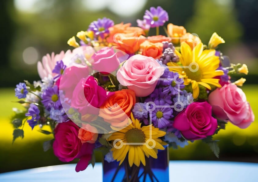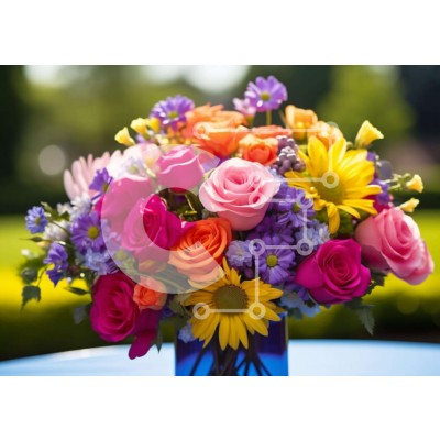 Υπάρχει δυνατότητα προσωποποίησης με δική σας φωτογραφία και προσαρμογής διαστάσεων κατόπιν παραγγελίας. Το συγεκεριμενο puzzle παρουσιαζει Η εικόνα δείχνει ένα ζωντανό μπλε βάζο γεμάτο με μια ποικιλία από έντονα χρώματα λουλουδιών, όπως τριαντάφυλλα, μαργαρίτες και ηλίανθους. Τα πράσινα φύλλα συμπληρώνουν τα λουλούδια, ενισχύοντας την αισθητική της διάταξης. Η σκηνή υποδηλώνει μια εορταστική περίσταση, πιθανώς γε