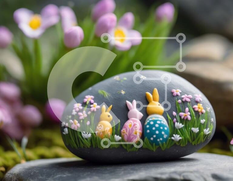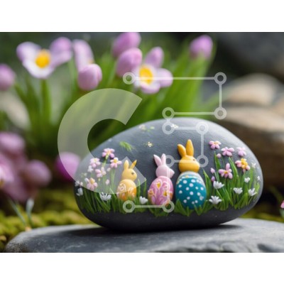 Υπάρχει δυνατότητα προσωποποίησης με δική σας φωτογραφία και προσαρμογής διαστάσεων κατόπιν παραγγελίας. Το συγεκεριμενο puzzle παρουσιαζει Αυτή η εικόνα παρουσιάζει έναν βράχο στολισμένο με τρία ζωγραφισμένα κουνελάκια, που περιβάλλεται από μωβ τουλίπες και μικρές πέτρες. Τα ζωηρά χρώματα και τα δημιουργικά σχέδια το καθιστούν ιδανικό διακοσμητικό για την άνοιξη, πιθανώς για τις γιορτές του Πάσχα. Ένα μοναδικό p