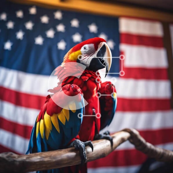 Υπάρχει δυνατότητα προσωποποίησης με δική σας φωτογραφία και προσαρμογής διαστάσεων κατόπιν παραγγελίας. Το συγεκεριμενο Puzzle 10x10 cm – 25 κομμ παρουσιαζει Η εικόνα παρουσιάζει έναν πολύχρωμο παπαγάλο σκαρφαλωμένο στο κλαδί μιας αμερικανικής σημαίας στο βάθος. Το πουλί φαίνεται να απολαμβάνει το περιβάλλον του, καθώς κάθεται με τα φτερά του ανοιχτά και το ράμφος του ανοιχτό. Είναι πιθανό ότι το